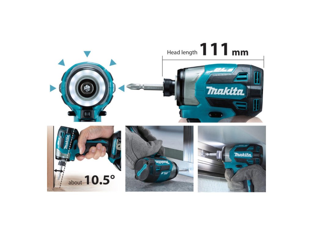 Tento aku skrutkovač ako prvý vo svojej rade disponuje kruhovým LED svetlom, ktoré úplne eliminuje tiene okolo bitu. Ovládanie na zadnej strane stroja vám umožní prepínať 4 režimy rázov a asistenčné funkcie palcom bez toho, aby ste museli prestať držať rukoväť. Vďaka bezuhlíkovému motoru a dvom batériám v balení je to akumulátorové náradie pre nepretržité profesionálne nasadenie.Hlavné vlastnosti a výhody skrutkovača DTD173RTJ