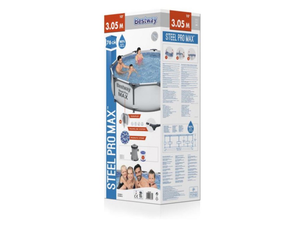Táto nadzemná bazénová súprava je tiež dodávaná s filtračným čerpadlom, ktorého prietok je až 1249 l/h, aby voda vo Vašom bazéne bola vždy krištáľovo čistá. Tento bazén je navyše veľmi ľahko nastaviteľný a zložiteľný pre mimosezónne skladovanie. Nie sú potrebné žiadne nástroje. Zároveň môžete záhradnú hadicu pripojiť k vstavanému regulačnému ventilu pre rýchle a jednoduché vypustenie vody z bazéna. Zažite leto vo vode s bazénom Bestway Steel Pro MAX!