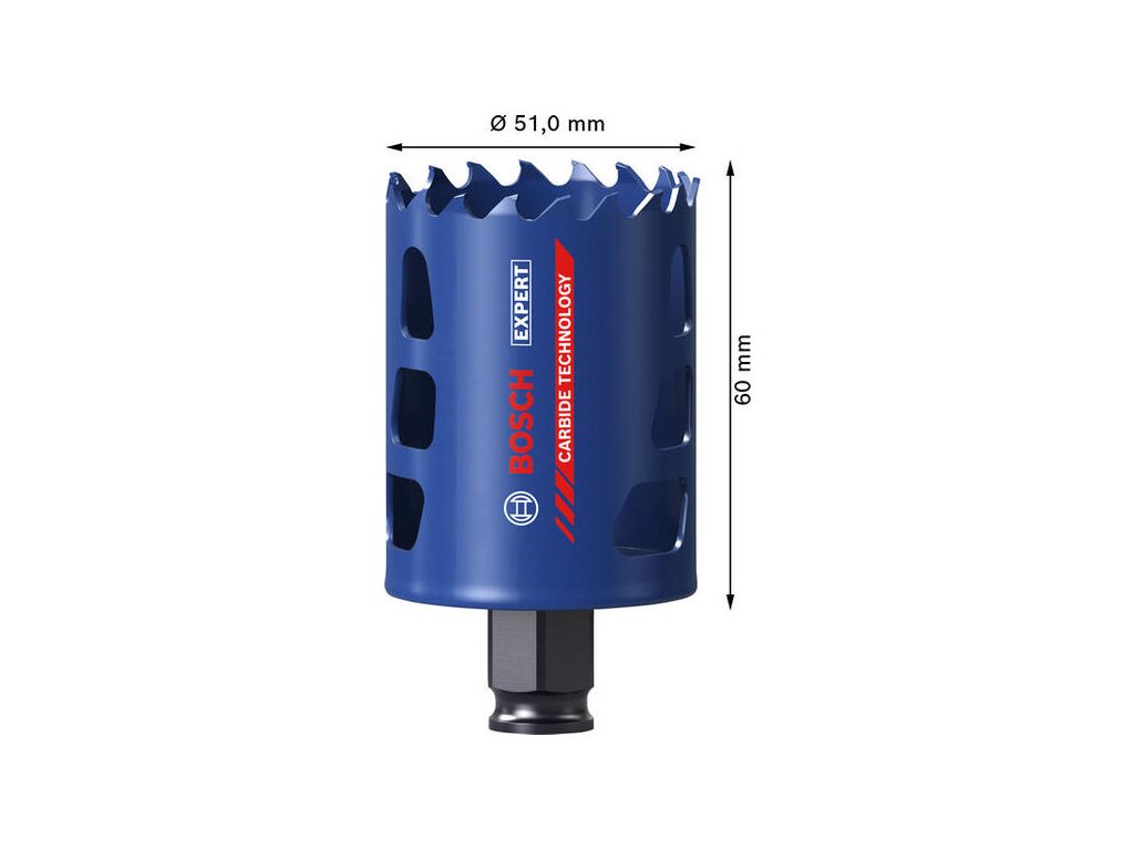 Pre otvory s priemerom 51 mm v akomkoľvek materiáli siahnite po dierovke Bosch EXPERT Multi Material. Jej karbidové zuby sú navrhnuté tak, aby odolali nárazom do kovu, čo znamená, že klince v dreve pre ňu nie sú prekážkou.