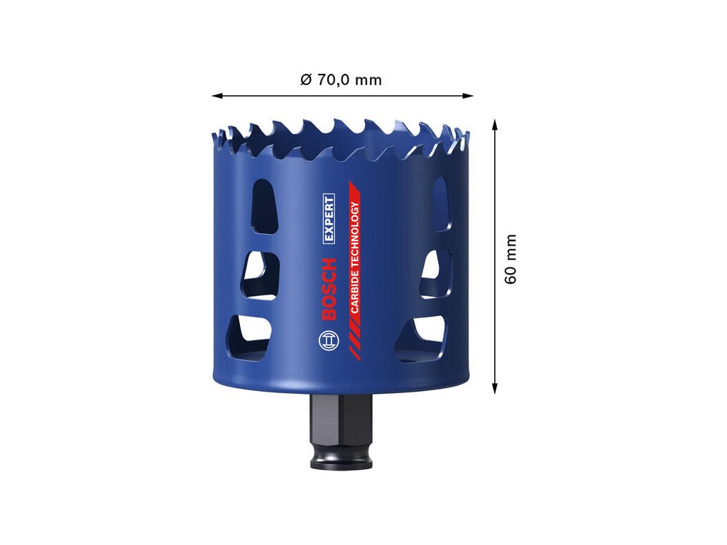 Pre špecifické otvory s priemerom 70 mm je tu dierovka Bosch EXPERT Multi Material. Jej univerzálnosť spočíva v schopnosti rezať drevo, kov, nerez aj tehlu bez nutnosti výmeny nástroja. Karbidové zuby sú zárukou dlhej životnosti.