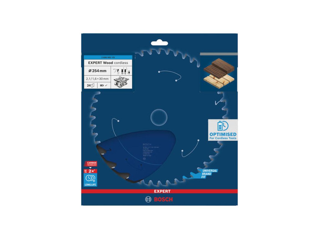 Pre akumulátorové pokosové a stolové píly 254 mm. Kotúč Bosch EXPERT Wood s 24 zubami je určený pre rýchle rezanie. Tenký profil (2,1 mm) maximalizuje výdrž batérie.