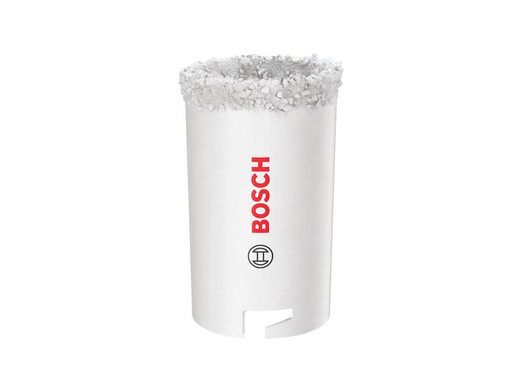 Pre otvory v murive s priemerom 43 mm je tu karbidová dierovka Bosch. Namiesto zubov má reznú hranu pokrytú karbidovou drvinou, čo jej umožňuje efektívne brúsiť cez tehlu, pórobetón a mäkké obkladačky.