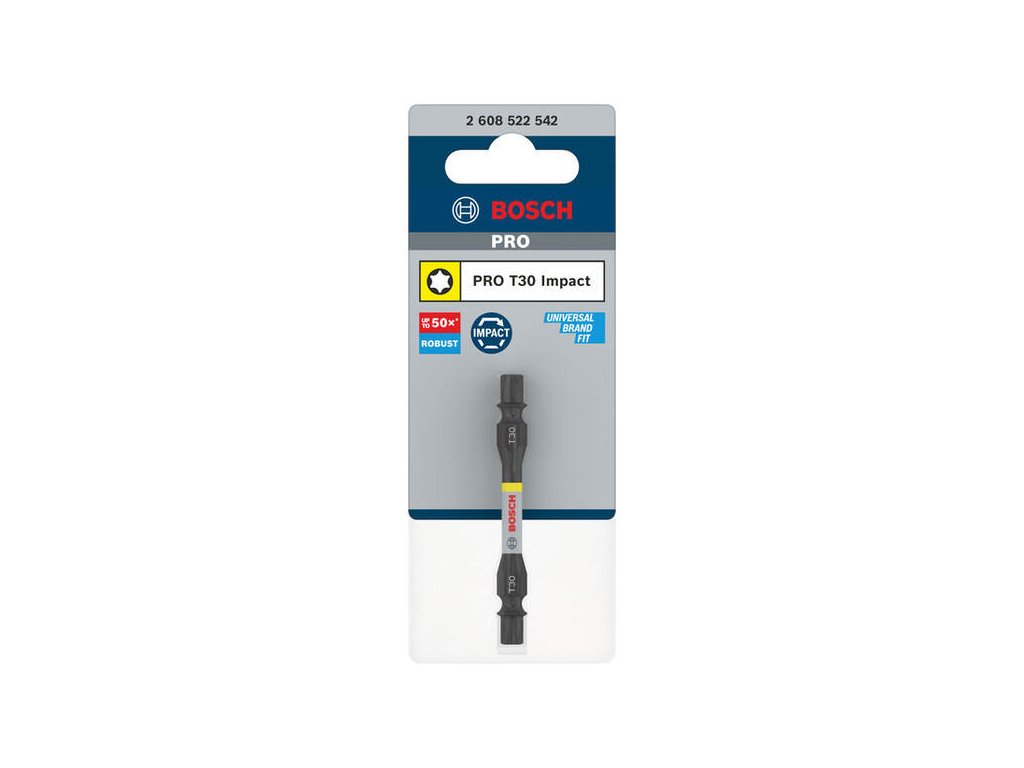 Silné bity T30 v obojstrannom prevedení pre maximálnu úžitkovú hodnotu. Odolávajú vysokému zaťaženiu v rázových uťahovačoch. Súčasťou je plastový klip pre systém Bosch Pick and Click.