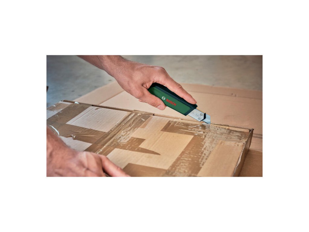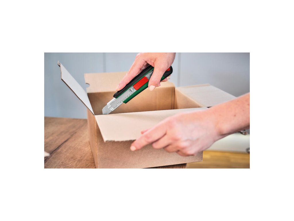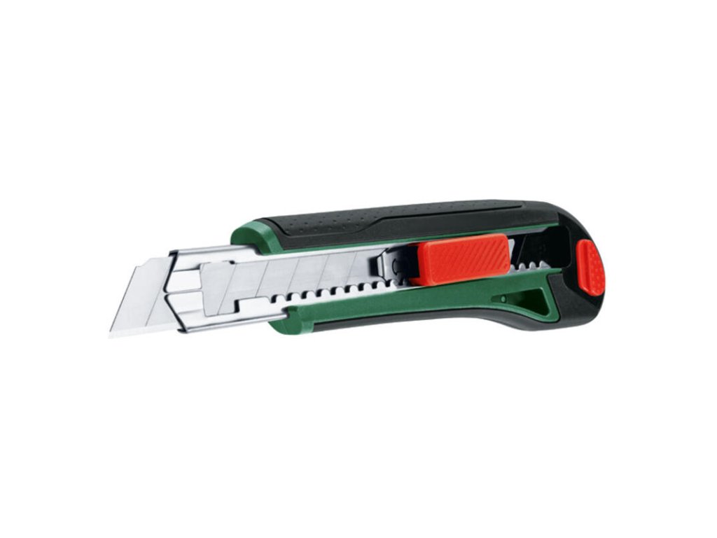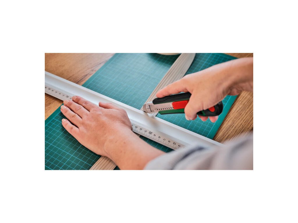 Rezanie kartónov, fólií alebo kobercov vyžaduje spoľahlivý nástroj. Odlamovací nôž Bosch je vybavený robustným kovovým vedením čepele a systémom Auto-Lock, ktorý automaticky zablokuje čepeľ v nastavenej polohe, takže sa pri tlaku nezasunie späť. Ergonomická rukoväť ukrýva praktický zásobník na náhradné čepele.