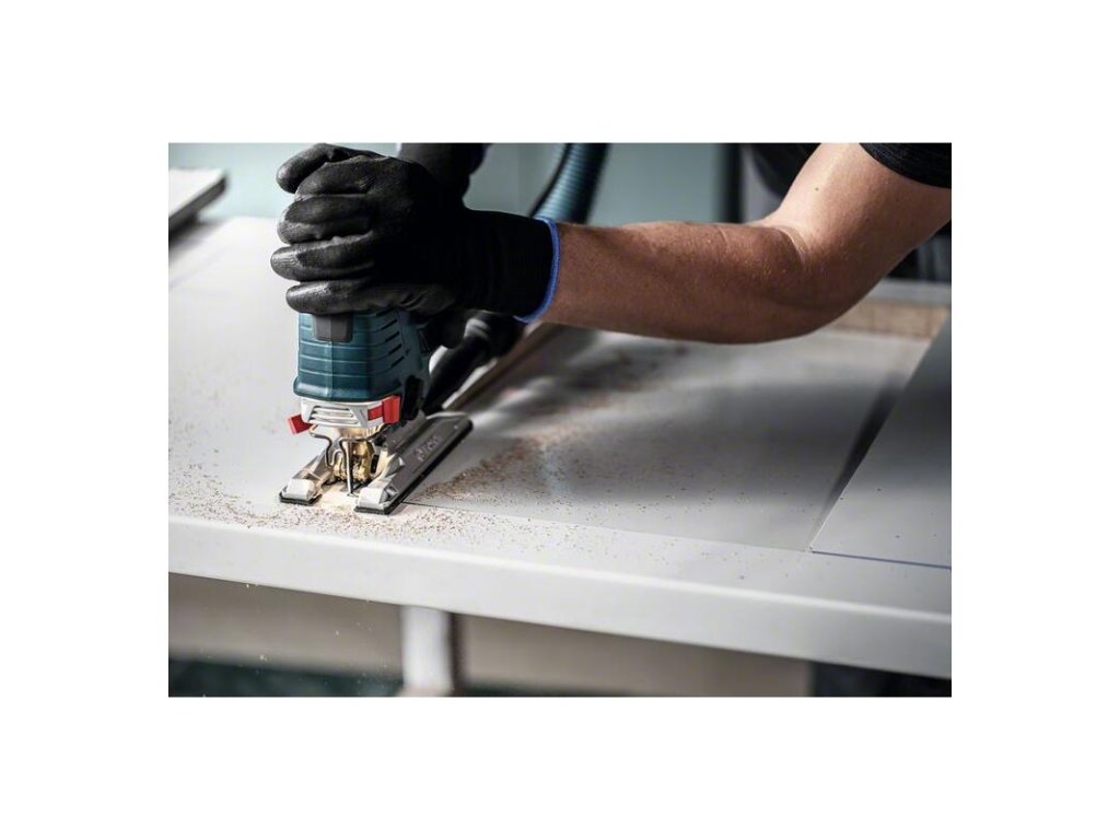 Rezanie laminovaných pracovných dosiek s vysokou presnosťou bez trhania! Zabezpečenie toho, aby bola čistá strana rezu priamočiarou na viditeľnej časti pracovného materiálu, bolo u stolárov a drevárov vždy umením. Niekedy môžete obrobok otočiť, inokedy môžete držať samotnú priamočiaru pílu hore nohami. Alebo môžete použiť list EXPERT ‘Hardwood 2-side clean’, ktorý vďaka svojim protiľahlým zubom ponúka na oboch stranách perfektné rezy bez ostrapov. Pílový list priamočiarej píly Bosch EXPERT Hardwood 2-side clean je vyrobený z dvoch kovov – je to pás kovu na rýchle rezanie spojený s pružnou oceľovou čepeľou, takže vzniká silný a flexibilný materiál. Vďaka tomu je dostatočne robustný na rezanie kuchynských pracovných dosiek z laminovanej drevotriesky alebo tvrdého dreva. Je dostupný na priame rezy bez ostrapov (T308BF) a pre obzvlášť presné uhlové rezy bez ostrapov (T308BFP).