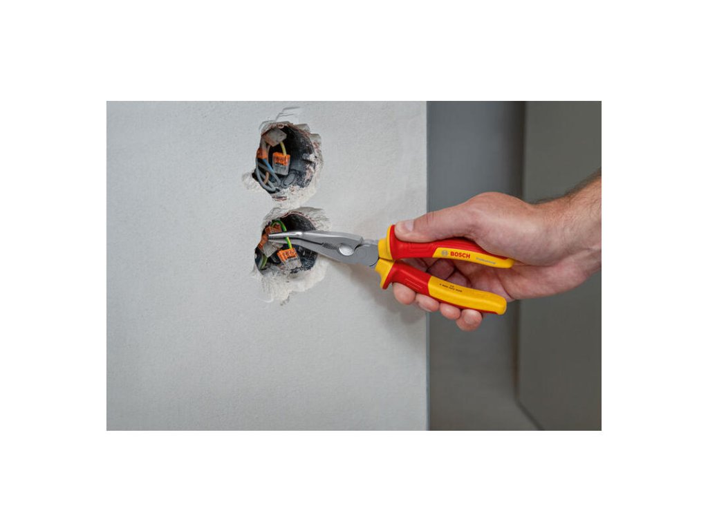 Kliešte Zahnuté kliešte s dlhými čeľusťami, 40° VDE 200 mm, Profesionálni remeselníci potrebujú náradie, ktoré sa ľahko používa a spĺňa všetky legislatívne požiadavky. Zahnuté kliešte s dlhými čeľusťami 40° VDE Bosch Professional umožňujú uchopiť alebo vyťahovať predmety, napr. klince, alebo štikať káble, a to aj keď dôjde k nečakanému kontaktu s komponentmi pod napätím. Toto náradie spĺňajúce požiadavky noriem je izolované termoplastickými polyuretánmi (TPU). Toto náradie bolo testované až do 10 000 V a disponuje certifikáciou VDE až do 1 000 V podľa normy DIN EN/IEC 60900. Sami zistíte, že s kliešťami VDE sa komfortne manipuluje a ľahko štiká. Umožňujú dobré uchopenie predmetov, štikanie a majú dlhú životnosť. Tieto odolné kliešte sú vyrobené z robustnej chróm-vanádiovej ocele a majú tvrdené ostria. Vďaka ručnému náradiu VDE pridanému do nášho radu Bosch Professional získavate náradie spoľahlivej kvality Bosch, ktoré spĺňa vaše požiadavky. Tieto odolné kliešte sú vhodné na uchopenie alebo vyťahovanie predmetov, napr. klincov, a štikanie káblov. Vďaka ergonomickému mäkkému úchopu sa komfortne používajú. Hang Tag