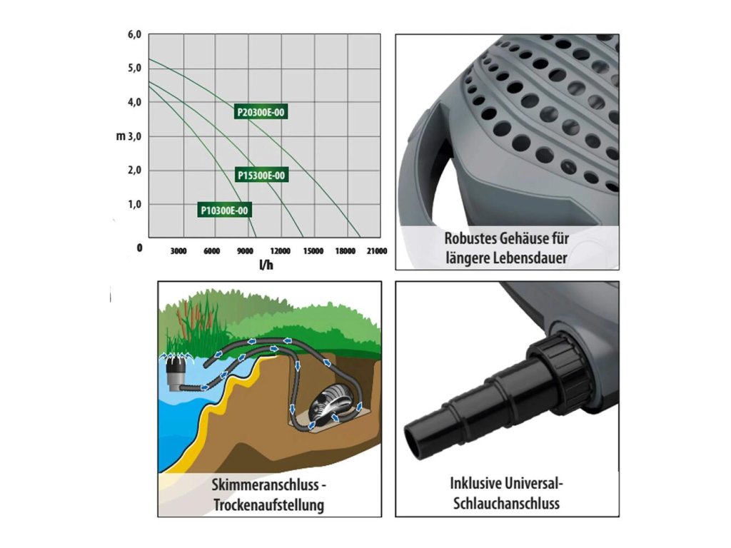 Výkon čerpadla môžete prispôsobiť potrebám vášho jazierka, napríklad zvýšiť výkon na filtráciu v lete, znížiť výkon na jar a na jeseň. Upravte prísun kyslíka do vášho jazierka dodávaného vodopádom, nastavte časovač na 50 % výkonu cez deň, 10 % v noci. V prípade potreby individuálne nastavte výkon pre vodné hry. Reguláciou výkonu a spotreby ušetríte náklady na energiu. Robustné telo zabezpečuje dlhú životnosť jazierkového čerpadla a umožňuje prestup nečistôt do priemeru 10 mm. Čerpadlo môžete uložiť aj do vody. Hadicová prípojka má 3 úrovne, takže je možné pripojiť hadicu s priemerom 25 - 32 - 38 mm (1" - 1 1/2").