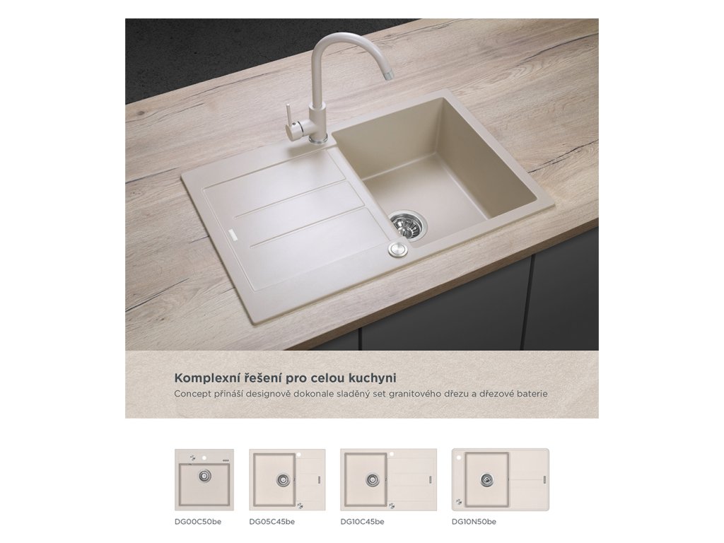 Drezová batéria BDG3334be je spracovaná v jednoduchom a elegantnom designe. Povrch batérie tvorí kvalitná farba s designom granitového povrchu v kombinácii s lesklými chrómovými detailmi. Dokonale ladí s béžovými granitovými drezmi Concept. Tento model ponúka ďalšie 3 farebné varianty: čierna (BDG3334bc), biela (BDG3334wh) a lesklá chrómová (BDC3334).