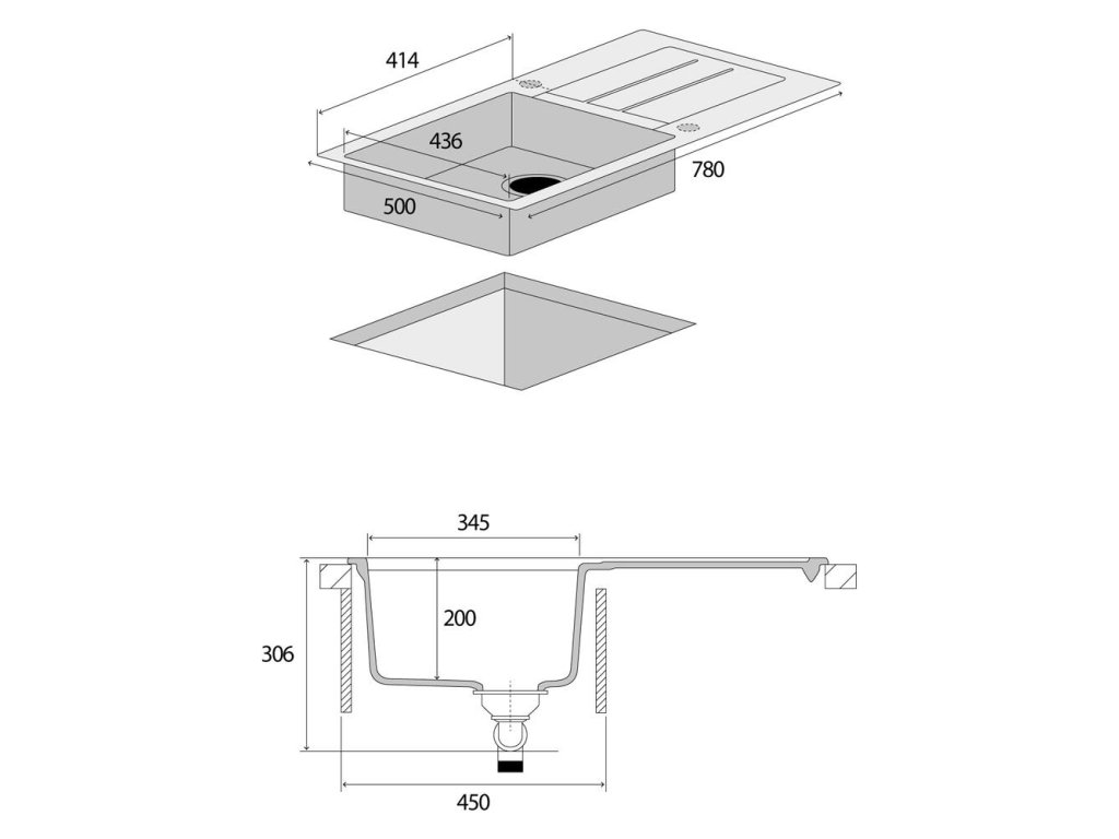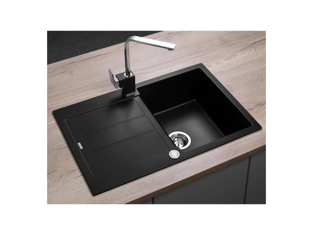 Granitový drez s odkvapom čiernej farby. Rozmery (d x š x h): 500 x 780 x 306 mm