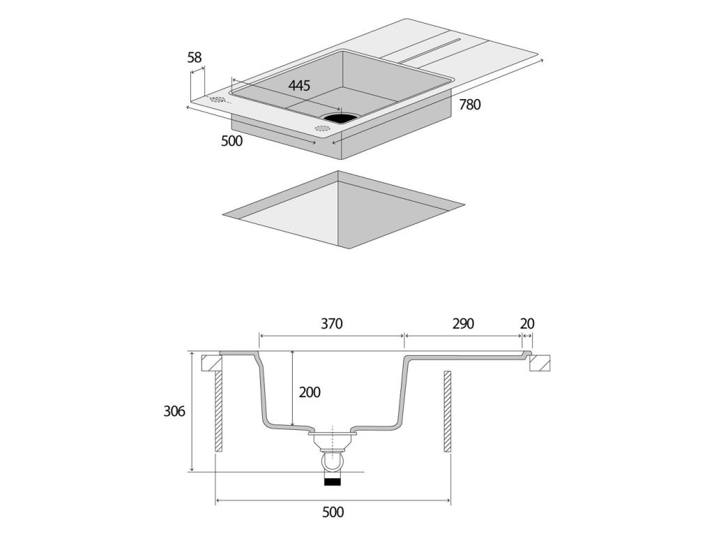 Granitový drez s odkvapom čiernej farby. Rozmery (d x š x h): 500 x 780 x 306 mm