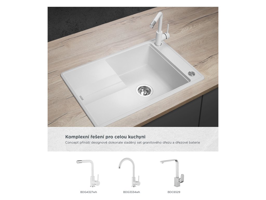Atraktívny vzhľad, kvalitné spracovanie, vysoká odolnosť a ľahká údržba, to sú hlavné prednosti granitových drezov Concept. Perfektne zapadnú do každej kuchyne a v kombinácii s batériami Concept tvoria dokonale zladený celok. Model DG10N50wh je súčasťou designovej rady NOBLES, ktorú spájajú moderné línie s prepracovanými detailmi. V kuchyni pôsobia veľmi nadčasovým a elegantným dojmem.