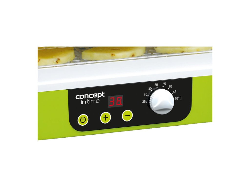 Kvalitná sušička potravín s 5 automatickými programami s reguláciou teploty od 35 – 70 °C, elektronický časovač a podsvietený LED displej.