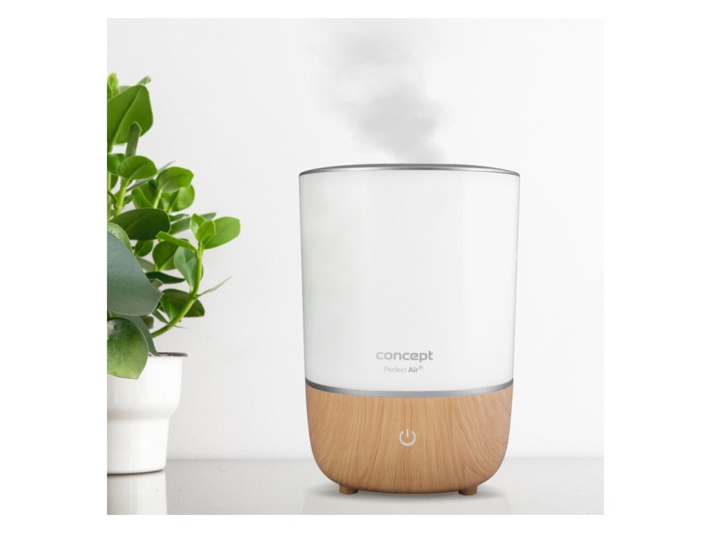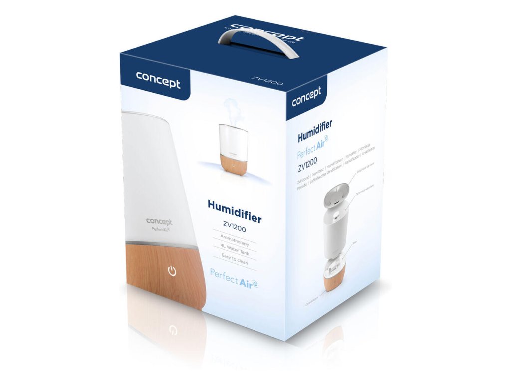 Zvlhčovač vzduchu ZV1200 z rady Perfect Air je spojením zvlhčovača a aroma difuzéra. Je vhodný do miestnosti s veľkosťou až 30 m2. Ponúka 3 úrovne intenzity pary s maximálnym výkonom 260 ml/h. Disponuje zásobníkom na vodu s objemom 4 l, ktorý dokáže vytvárať jemnú paru po dobu až 26 h. Pri nedostatku vody sa prístroj automaticky vypne.