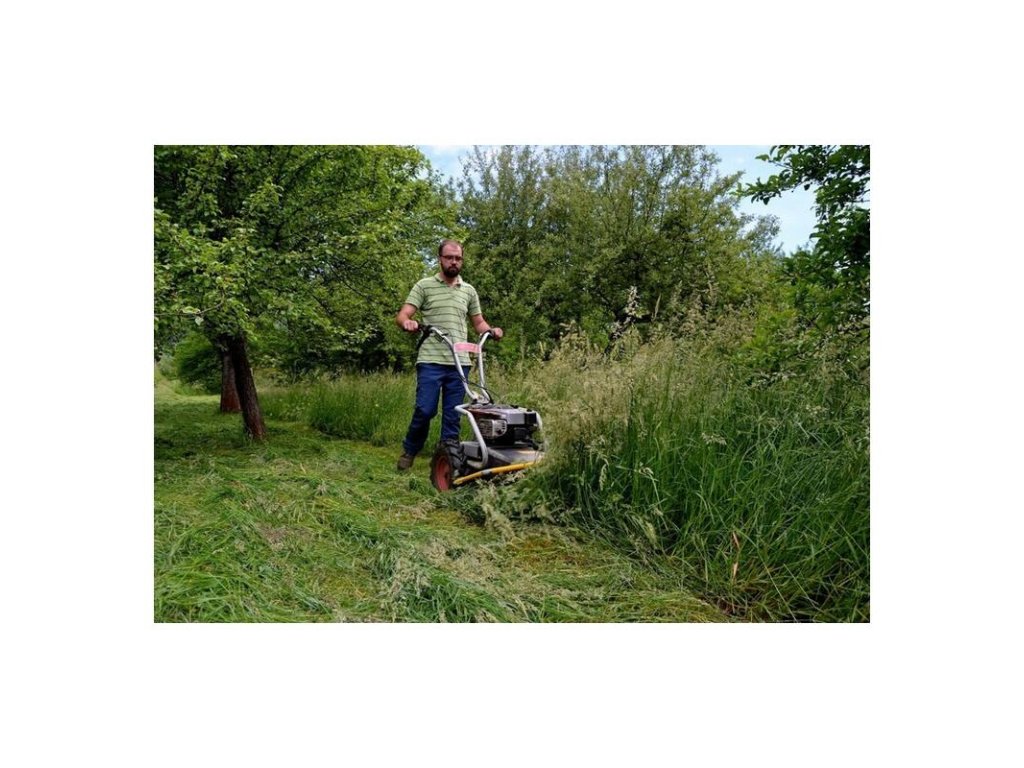 Trojrýchlostná stavebnicová kosačka s nastaviteľnou výškou kosenia a možnosťou prestavby na 12 rôznych pracovných strojov, s originálnym profesionálnym motorom s liatinovou vložkou valca Briggs@Stratton 850/IC vyrobeným v USA, s pohonom na nápravu reťazou a možnosťou pri práci sedieť na prípojnej sedačke.
