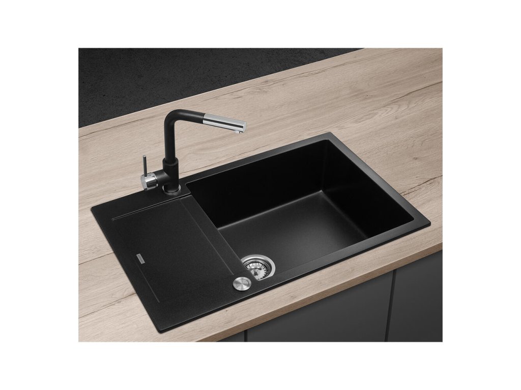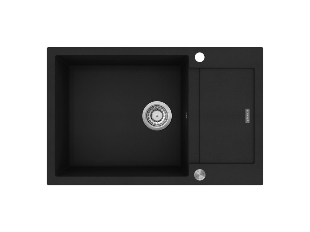 Granitový drez s odkvapom čiernej farby. Rozmery (d x š x h): 500 x 860 x 306 mm