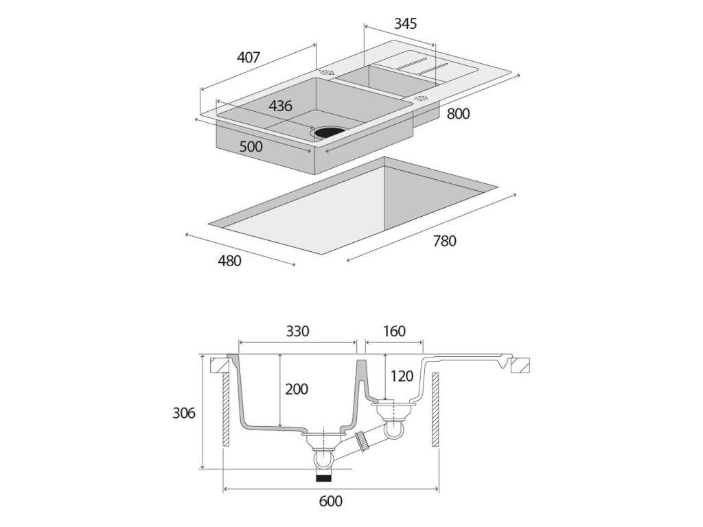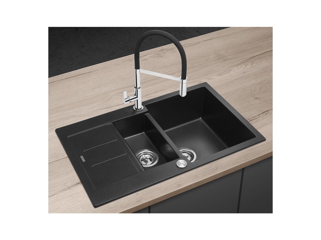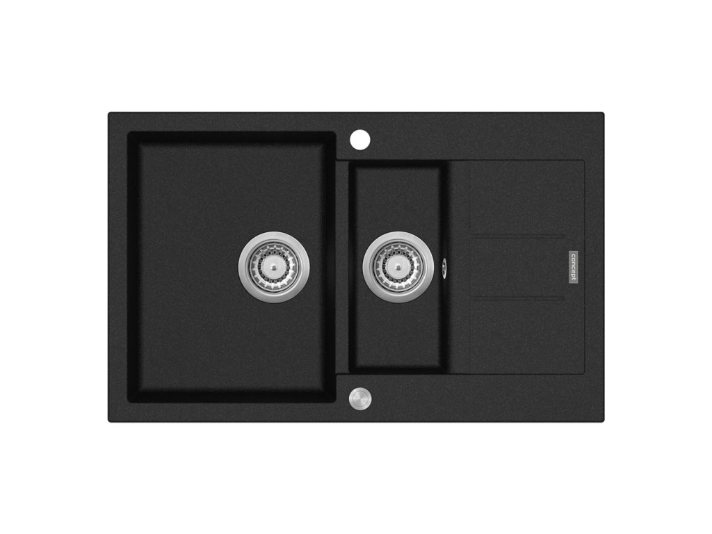 Granitový drez s odkvapom čiernej farby. Rozmery (d x š x h): 500 x 780 x 306 mm