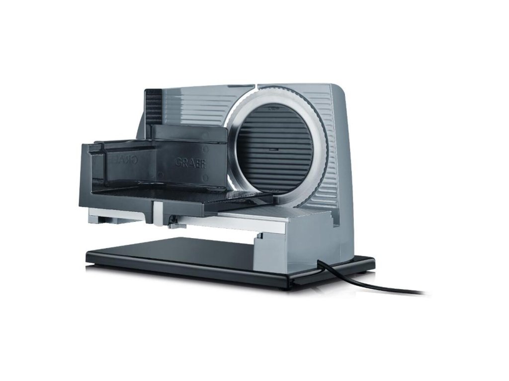 Elektrický krájač GRAEF využíva zúbkovaný nerezový rezný kotúč s priemerom 170 mm s bezpečnostným odnímateľným krytom.