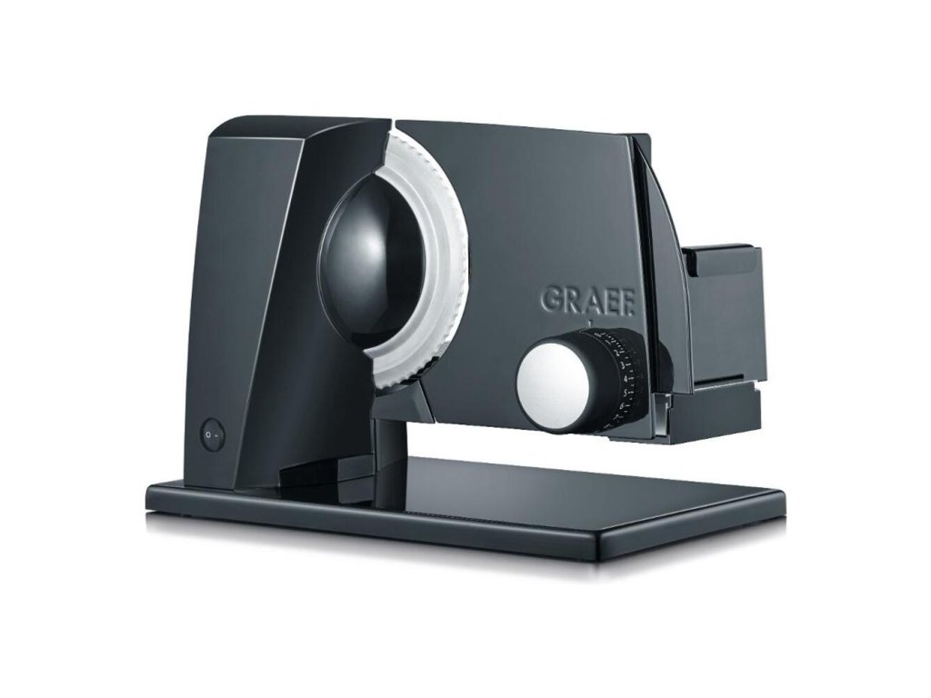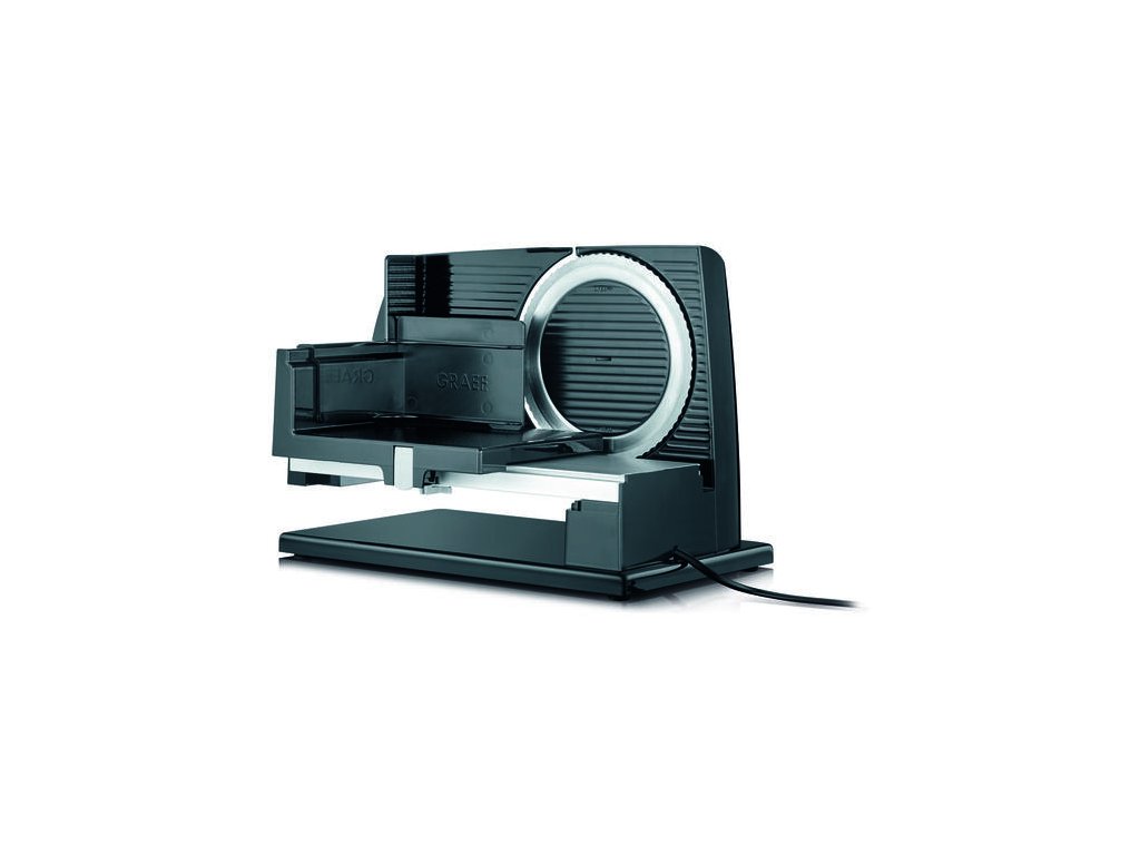Krájač potravín GRAEF SKS 11000 s nerezovým ozubeným rezným kotúčom pre krájanie plátkov s hrúbkou 0 až 20 mm. Maximálny príkon je 170 W.