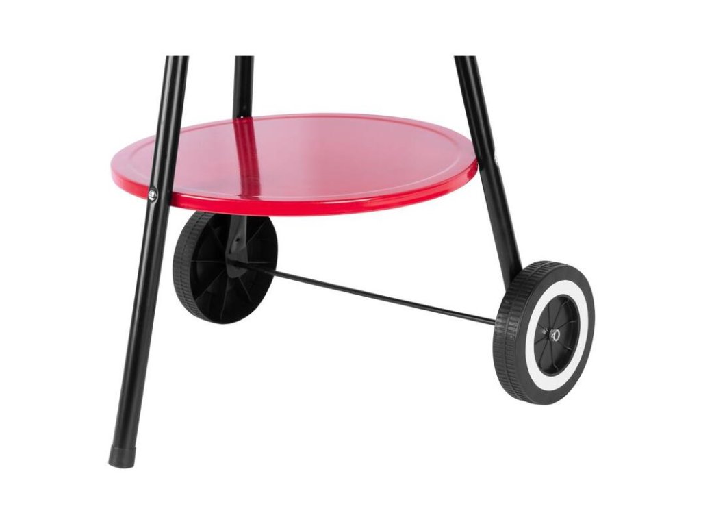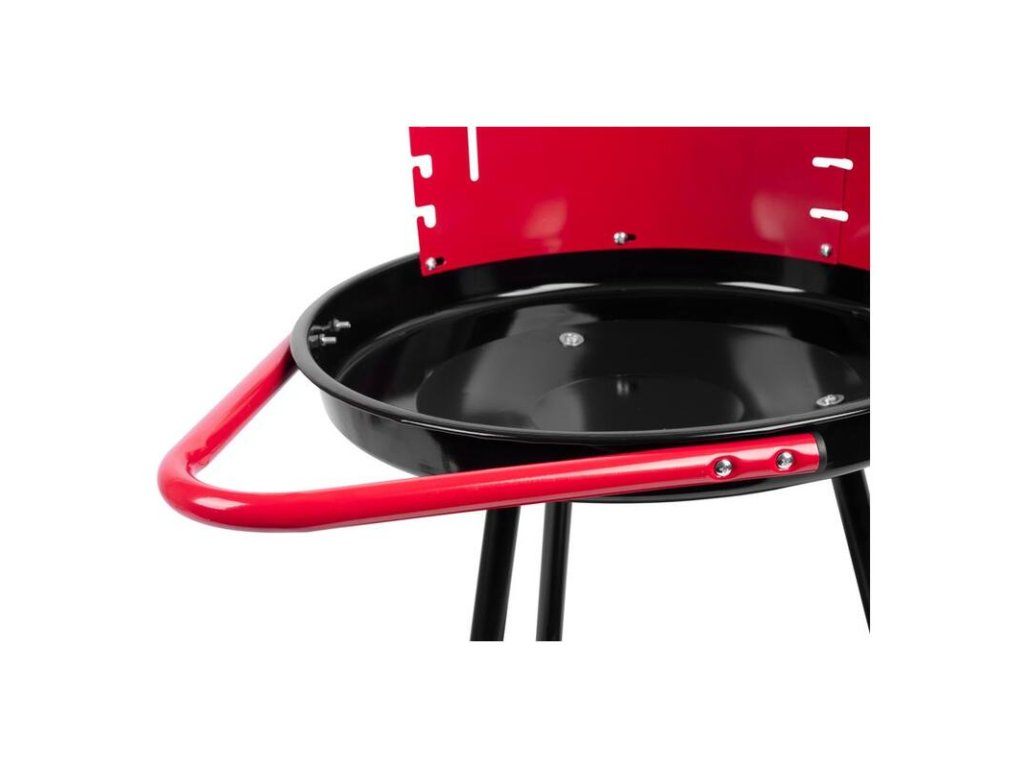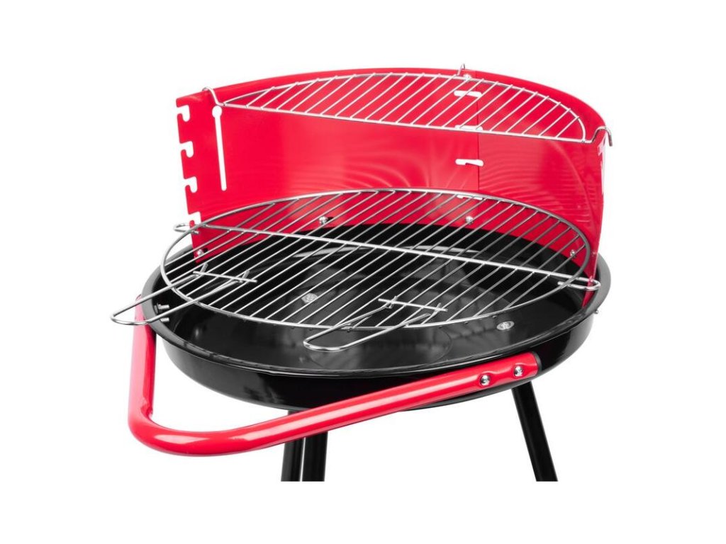 Gril je praktický, ľahko prenosný, vhodný na letné grilovanie. Vrchný grilovací rošt je pochrómovaný a je vyrobený z drôtu s hrúbkou 3,5 x 2,5 mm. Grilovacia misa pod roštom má hrúbku 0,6 mm a je vypaľovaná farbou odolnou voči vysokým teplotám. Nad samotným grilovacím roštom sa nachádza ešte jeden, menší, polkruhový rošt, ktorý slúži pre účely odkladania, prípadného ohrievania jedla. Výhodou tohto grilu je veterná clona, ktorá zabráni tomu, aby Vám prípadný vietor narúšal intenzitu horenia uhlíkov v grilovacej miske. Veterná clona má na bočných stranách 5 výrezov, čím ponúka 5 možných výšok nastavenia grilovacieho roštu. Súčasťou konštrukcie je tiež plechová odkladacia plocha pod grilovacou miskou, kde si viete položiť taniere alebo kliešte na obracanie. Spodná podstava je tvorená tromi nohami hrubými 22 mm, pričom dve z nich sú ukončené kolieskami, ktoré zabezpečujú jednoduchú manipuláciu a premiestnenie podľa vašej potreby.