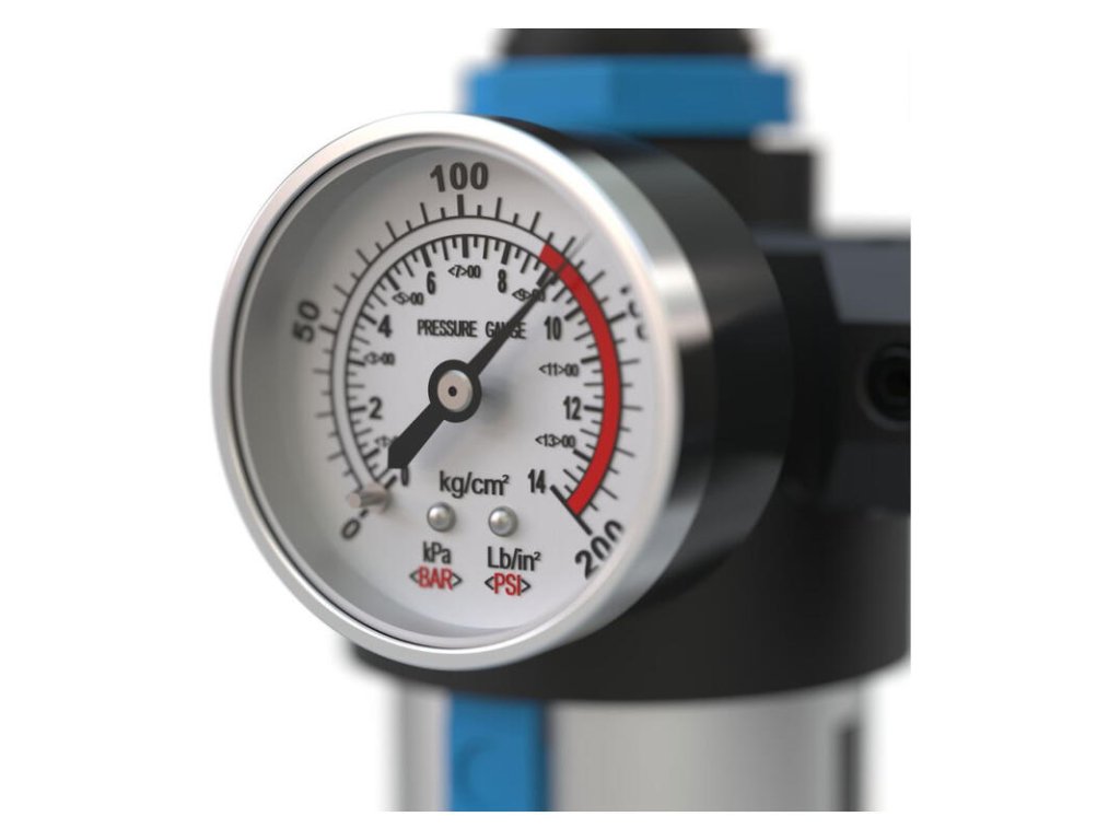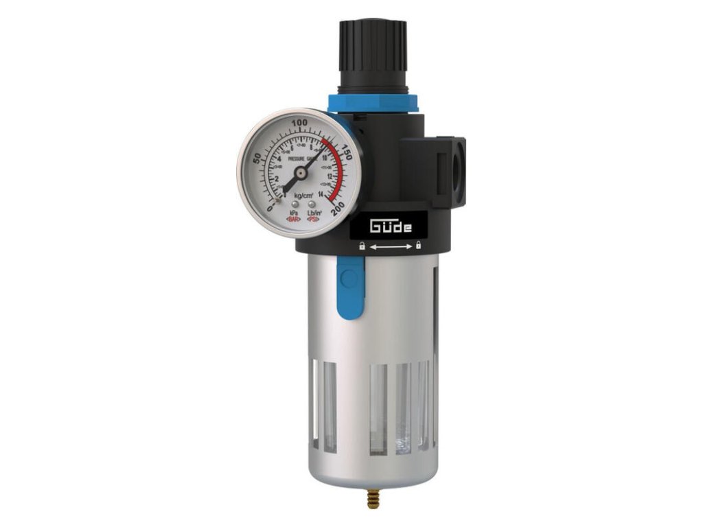 Redukčný ventil s vnútorným pripojovacím závitom 3/8" reguluje a stabilizuje tlak stlačeného vzduchu, aby sa zabezpečilo, že zariadenia v pneumatickom systéme budú pracovať v bezpečnom a optimálnom rozsahu tlaku, aby sa zabránilo poškodeniu pretlakom a aby sa zvýšila efektivita práce. Čistí a filtruje stlačený vzduch. Priehľadné záchytné sklo (PVC). Vrátane vypúšťacieho ventilu a manometra.