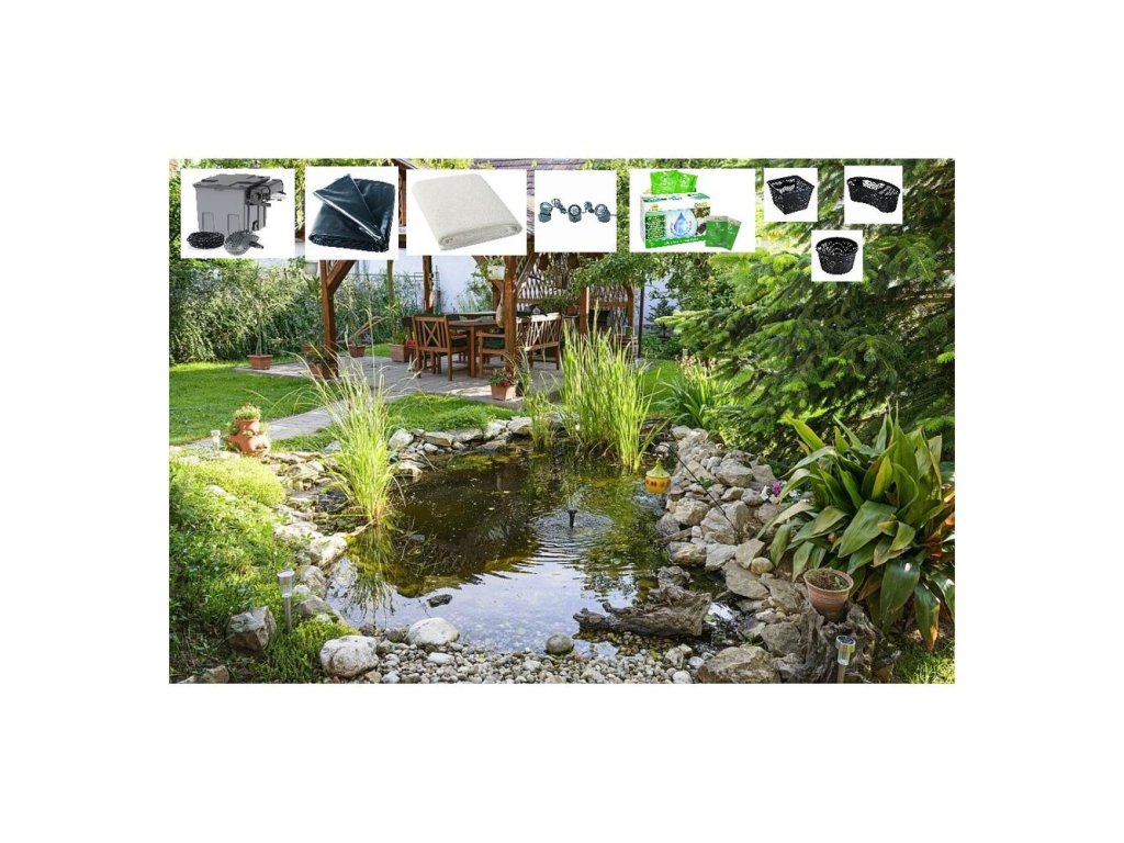 Súprava na výstavbu okrasného jazierka obsahuje jazierkovú fóliu, ochrannú jazierkovú geotextíliu pod fóliu, prietokovú filtráciu jazierka dimenzovanú na chov rýb vrátane filtračných médií, bio domčeky na osídlenie jazierka baktériami, filtračné špongie na hrubé nečistoty, nízkovýkonné regulované čerpadlo, UV lampu na riasy, hadicové prípojky na pripojenie čerpadla k filtrácii a jazierkovú hadicu. Okrem toho ročná súprava obsahujúca prípravok na úpravu vody, ktorý reguluje tvrdosť a ph vody, aby umožnil správne fungovanie jazierkových baktérií, odstraňuje z vody živiny, pričom druhou zložkou sú práve jazierkové baktérie. Obsahuje 10 vrecúšok, čo stačí na pokrytie celej sezóny. Svetlá do jazierka možno používať vo vode alebo mimo nej, vrátane vymeniteľných farebných sklíčok na zmenu farby svetiel. Koše na sadenice pre vodné rastliny. Návod s návrhom na vybudovanie jazierka.