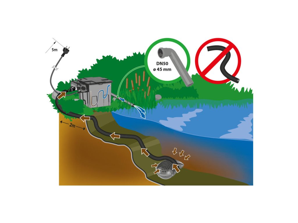 Pumpu umiestnite na opačnú stranu filtračného systému, aby dochádzalo k prirodzenej cirkulácii vody. Prívodnú hadicu a elektrický kábel veďte tak, aby pri používaní jazierka nedochádzalo k zbytočnému kontaktu a posunu čerpadla.
