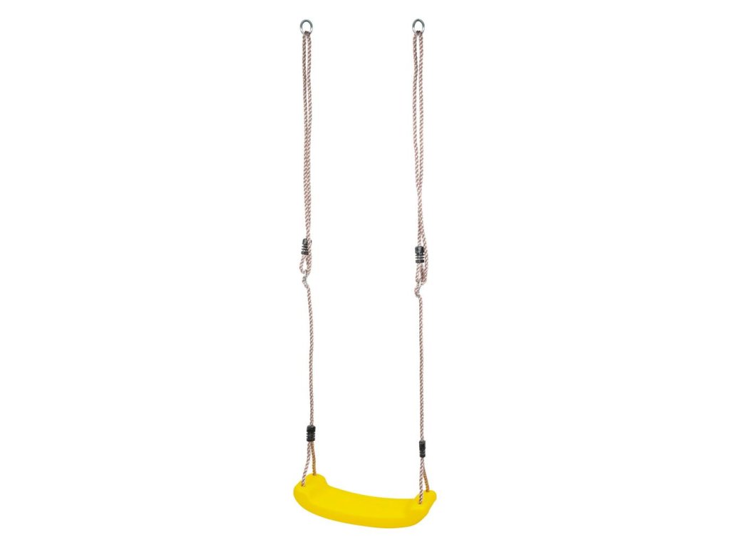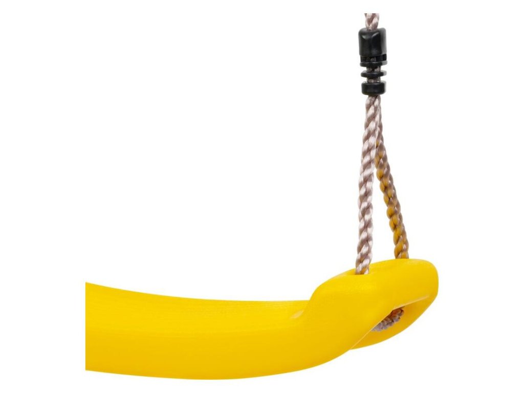 Detská žltá plastová hojdačka je praktická, ľahko umiestniteľná takmer kdekoľvek vo vašej záhrade. Hojdačka nemá opierku a nemá ani prednú ochranu pred pádom, preto je potrebné na dieťa dávať pocelý čas pozor. Nosnosť hojdačky je 70 kg a jej rozmery sú 43 x 17 x 8,5 cm. Na oboch stranách sedacej časti sú pripevnené laná dlhé 2 m, s priemerom 10 mm. Je potrebné ich poriadne uviazať na miesto, kde chcete hojdačku mať. Uistite sa, že je pripevnená správne, nie príliš vysoko a že nehrozí riziko poranenia.