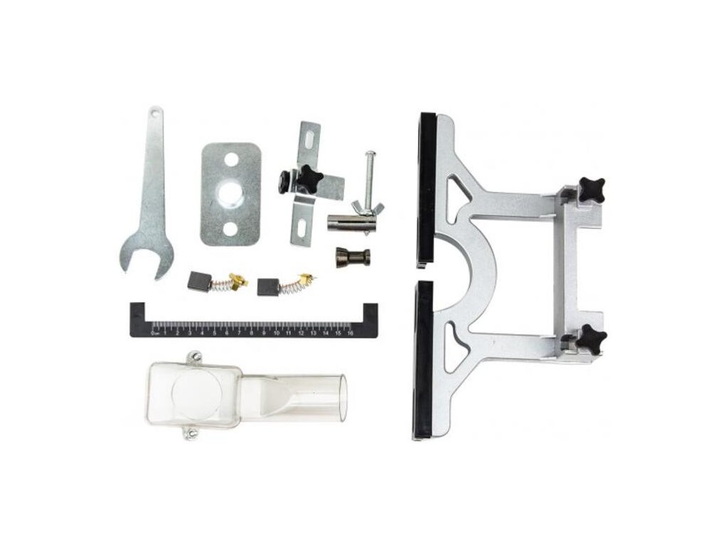 V základnej výbave nájdete aj praktické prvky ako pozdĺžny doraz s vodiacimi tyčami a upínacie kliešte, ktoré zvyšujú presnosť a bezpečnosť práce.
