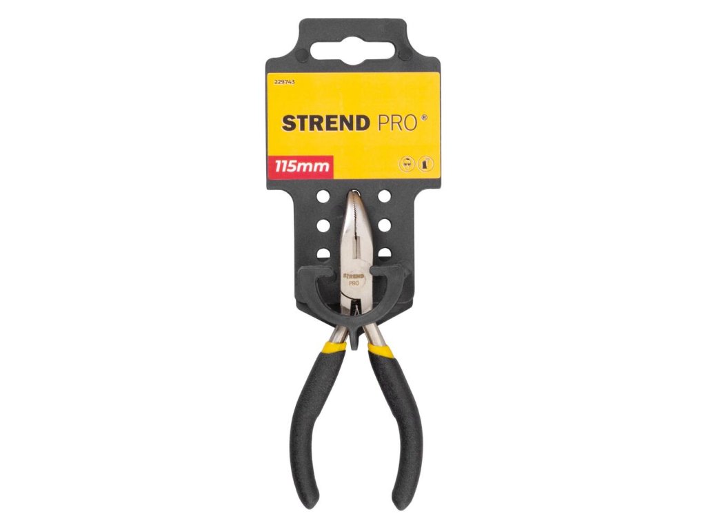 Vyhnuté kliešte Strend Pro by nemali chýbať vo vašej dielni. Sú vhodné pre prácu v ťažko prístupných miestach. Dĺžka je 115 mm.