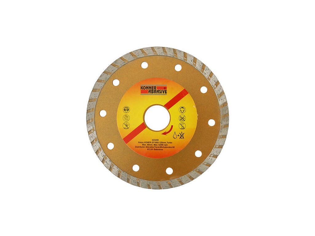 Diamantový kotúč KONNER je vhodný pre domácich kutilov, ale aj pre profesionálnych remeselníkov. Vhodný je na mokré aj suché rezanie. Konštrukcia TURBO+ lemu zachytáva vzduch v pohybe, čím lepšie odvádza materiál, čo zaručuje čistejšie rezné hrany bez odlamovania materiálu, rýchlejšie rezy, optimálnu životnosť a zároveň dochádza k redukcii zahrievania. Chladiace otvory pomáhajú zvýšiť viditeľnosť pri rezaní odvádzaním materiálu a zaisťujú rozptyl tepla. Má široké využitie - žula, dlažba, obklad, kov a možno ho použiť aj na mramor, tehly, kameň, murivo a strešnú krytinu. Jeho priemer je 180 mm a maximálne povolené otáčky sú 8 400 rpm.Dodatočné parametre