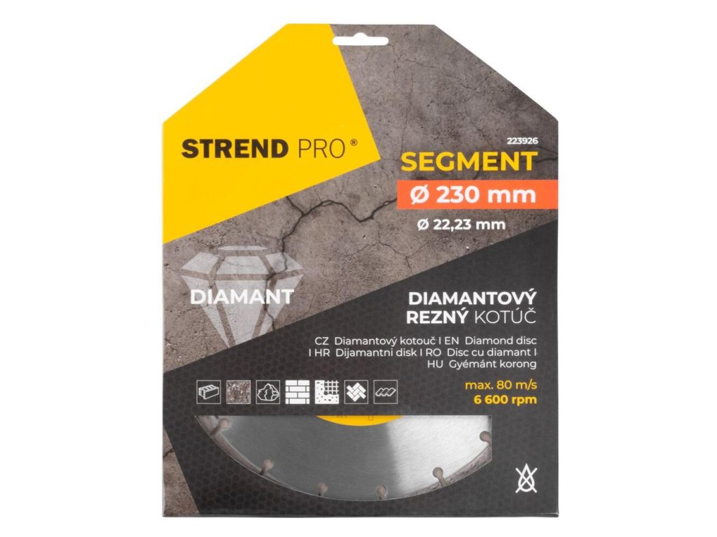 Diamantový kotúč Strend Pro je vhodný pre domácich kutilov, ale aj pre profesionálnych remeselníkov. Vhodný je na suché rezanie. technológia SEGMENT poskytuje najvyššiu rýchlosť a výborné chladenie kotúča. Má široké použitie - betón, žula, kameň, murivo, tehly, železobetón a možno ho použiť na obklad, dlažbu a strešnú krytinu. Jeho priemer je 230 mm a maximálne povolené otáčky sú 6 600 rpm.