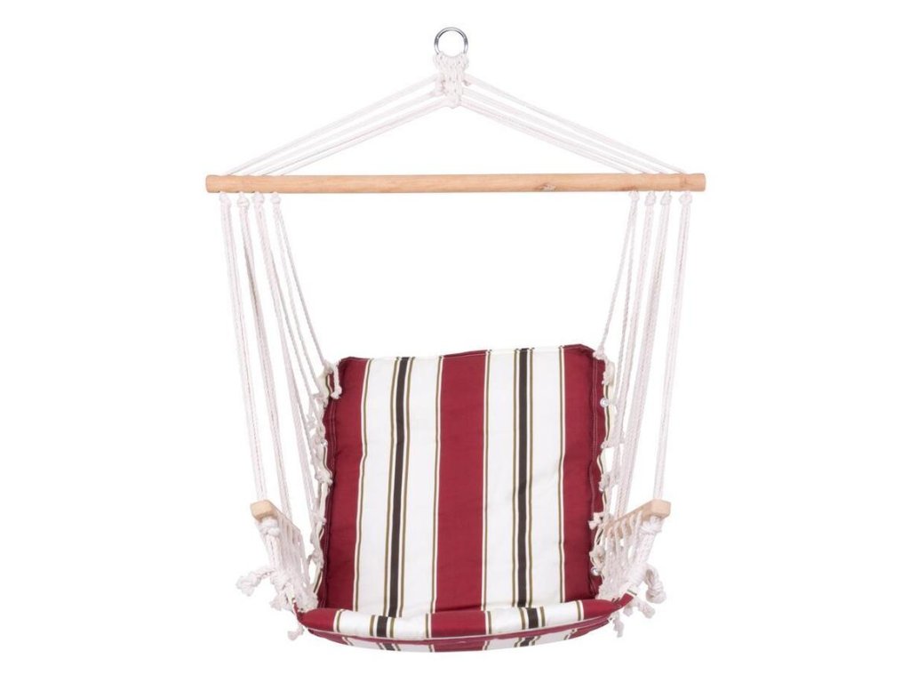 Bavlnené závesné červené kreslo je možné využiť vo vnútorných ale i vonkajších priestoroch. Kreslo je potrebné zavesiť na predom navŕtaný hák. Nosnosť je 150 kg a rozmery kresla sú 100 x 50 cm. Bavlnená sedacia časť je spevnené drevom, pre poskytovanie väčšej opory a pohodlia.