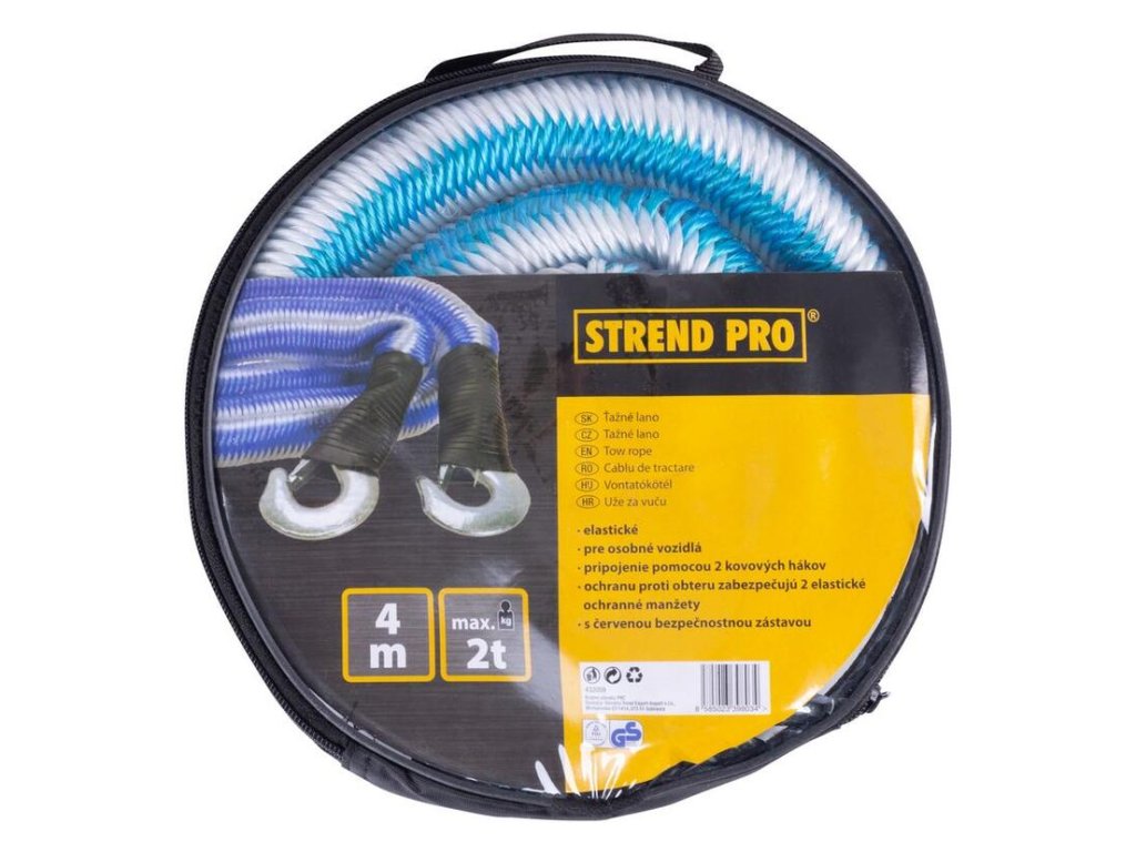 Ťažné lano na auto Strend Pro slúži na bezpečné vlečenie auta. Lano je vyrobené z odolného materiálu pre dlhú životnosť a bezpečnosť. Je vybavené pevným hákom z vysoko kvalitnej zliatiny. Dĺžka je 4 m a maximálna nosnosť je 2 t.Technické parametre: