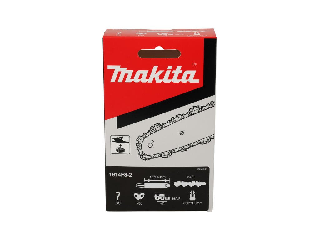 Makita 1914F8-2 je odolná pílová reťaz typu M43 pre dĺžku lišty: 40 cm (16") a štandardnou šírkou drážky 1,3 mm (56 článkov). S delením 3/8" je vhodná pre výkonné motorové a aku reťazové píly Makita (napr. UC4041A, PS35C/TLC, DUC357). Tvar zubu SC zabezpečuje efektívny a rýchly rez.