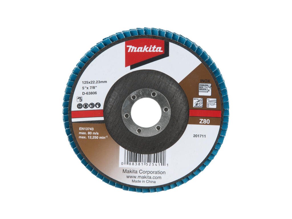 Profesionálny lamelový brúsny kotúč Makita D-63806 s priemerom 125 mm a zrnitosťou 80 (P80). Brúsne lamely sú vyrobené zo Zirkon alluminium, vďaka čomu je kotúč vysoko efektívny pri brúsení nehrdzavejúcej ocele (nerezu), bežných kovov a neželezných kovov.