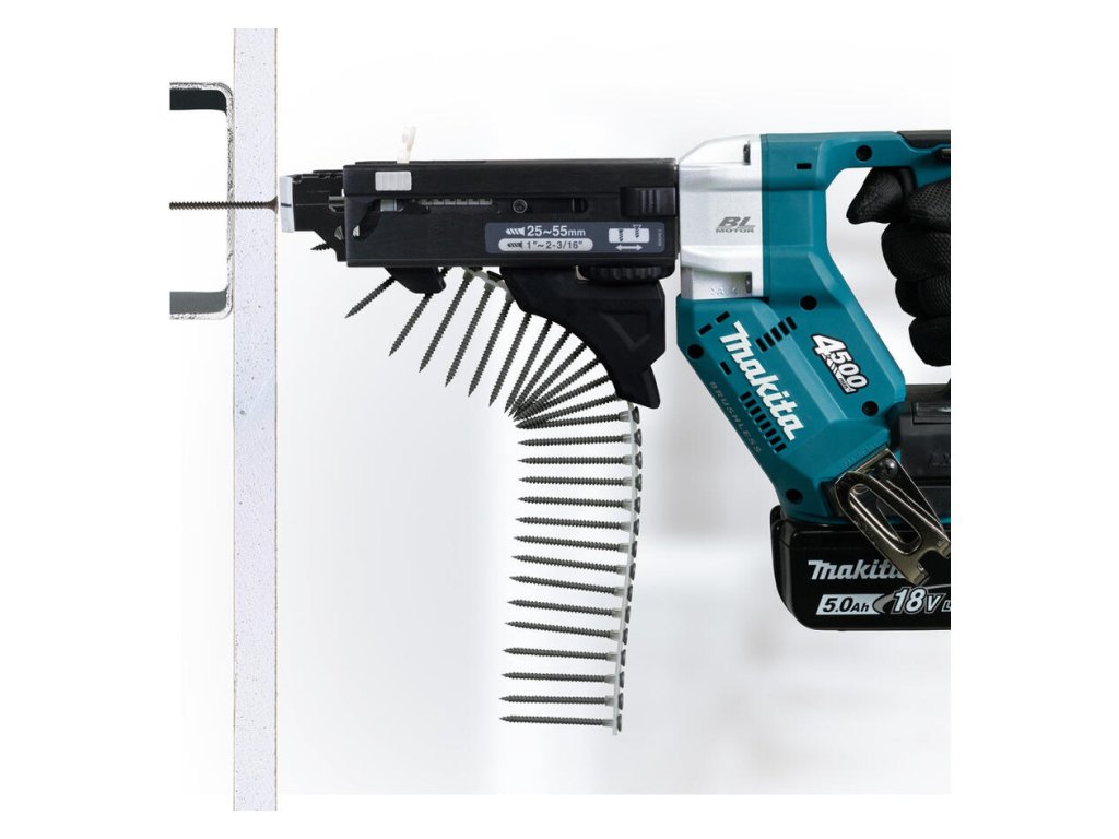 Makita DFR552Z je profesionálny akumulátorový skrutkovač na páskované skrutky, určený pre rýchlu a efektívnu montáž sadrokartónu a drevených konštrukcií. Vďaka systému Push-Drive sa motor aktivuje až pri kontakte s materiálom, čo výrazne predlžuje prevádzkovú dobu. Skrutkovač pracuje so skrutkami s dĺžkou 25 mm až 55 mm.