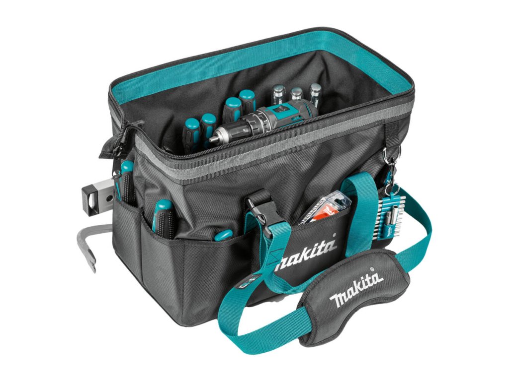 - Detaily: D-krúžok slúži na pripevnenie náradia pomocou karabín. Taška má dlhé polypropylénové pútka na ruky a viditeľné logo Makita.