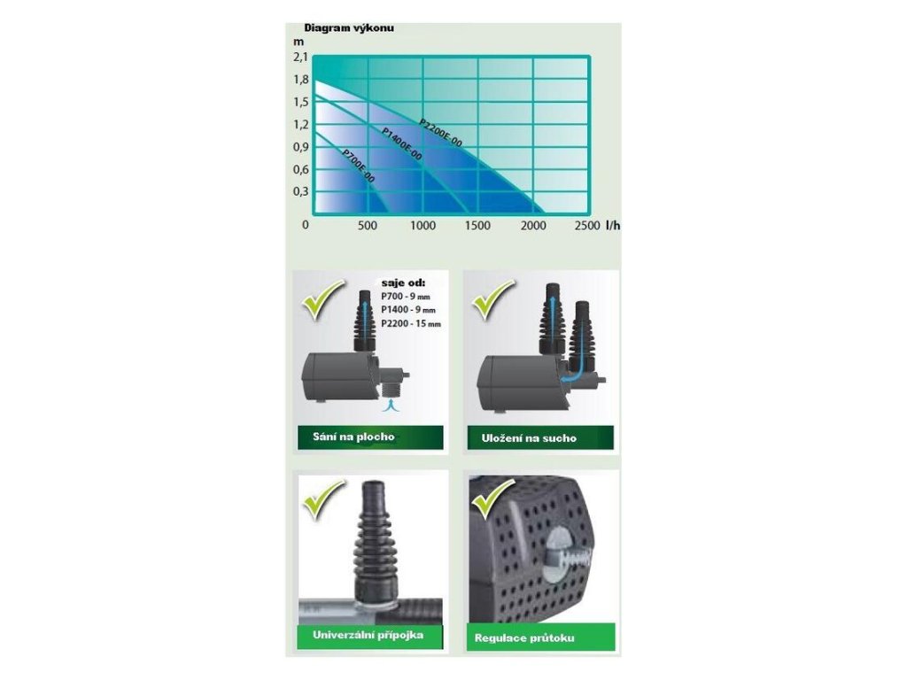 Má veľmi nízku spotrebu energie a vysoký stupeň účinnosti. Pri vývoji sa kládol dôraz na tichú prevádzku, funkčnosť a jednoduché čistenie. Čerpadlá sú určené na napájanie fontán, chrličov, terasových jazierok. Čerpadlo možno umiestniť do vody a vďaka dvom hadicovým prípojkám aj mimo vody. Pri napájaní fontán a chrličov oceníte možnosť regulácie prietoku vody. Vďaka kompaktným rozmerom ho ľahko umiestnite aj do malého priestoru, ľahko sa udržiava. Čerpadlo je vybavené synchrónnym motorom ECO, možnosť plochého sania.