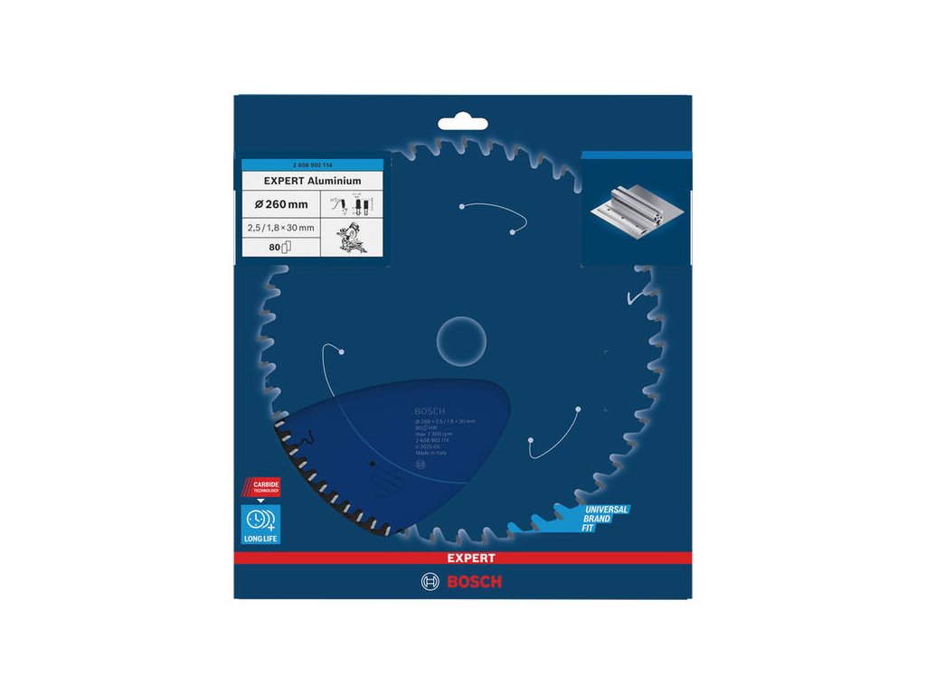 Dlhá životnosť pri rezaní hliníka! Keď potrebujete v dielni rezať hliníkové okenné profily, potrebujete pílový kotúč, ktorý je ostrý, presný a odolný. EXPERT Aluminium sme navrhli, aby sme vám pomohli ľahko vykonať prácu. EXPERT Aluminium má naostrené jemné karbidové zuby vyrobené technológiou Bosch Carbide Technology. To znamená, že pílový kotúč má dlhú životnosť a vykonáva presné rezy bez otrepov a potreby opätovného opracovania. Naniesli sme naň dodatočnú povrchovú úpravu, ktorá zabraňuje hromadeniu tepla a chráni ho pred koróziou.