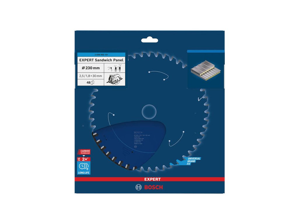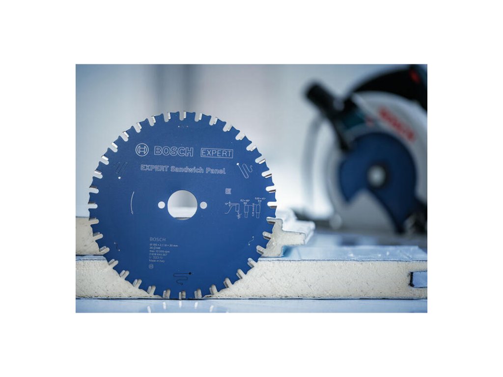 Rezanie sendvičových kovových panelov s dlhou životnosťou! Práca na priemyselnej stavbe zvyčajne znamená každodenné rezanie kovových sendvičových panelov. Tento stavebný materiál môže byť náročný a väčšina štandardných kotúčov, ktoré používate, sa veľmi rýchlo otupí. Nie však pílový kotúč EXPERT Sandwich Panel. Vyrobili sme ho tak, aby vám dlhodobo pomáhal dosahovať čisté rezy v sendvičových paneloch. EXPERT Sandwich Panel má naostrené jemné karbidové zuby vyrobené technológiou Bosch Carbide Technology. To znamená, že má dlhú životnosť a vykonáva čisté a presné rezy. Naniesli sme naň dodatočnú povrchovú úpravu, ktorá zabraňuje hromadeniu tepla a chráni ho pred koróziou.