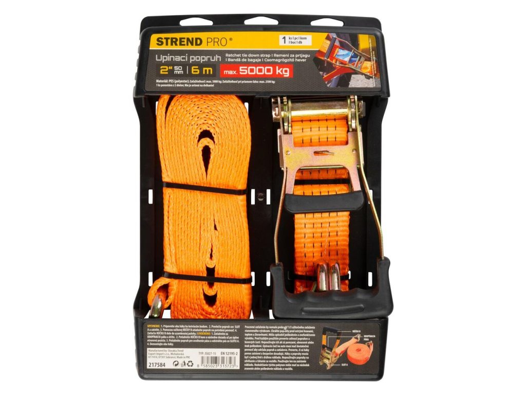 Upínací popruh Strend Pro má široké spektrum využitia. Slúži na zviazanie tovaru, zavetrovanie konštrukcií, na kotvenie stanov, koncertných stageov a podobne. Jeho dĺžka je 6 m, šírka je 50 mm a maximálna nosnosť je 5 000 kg.Technické parametre:
