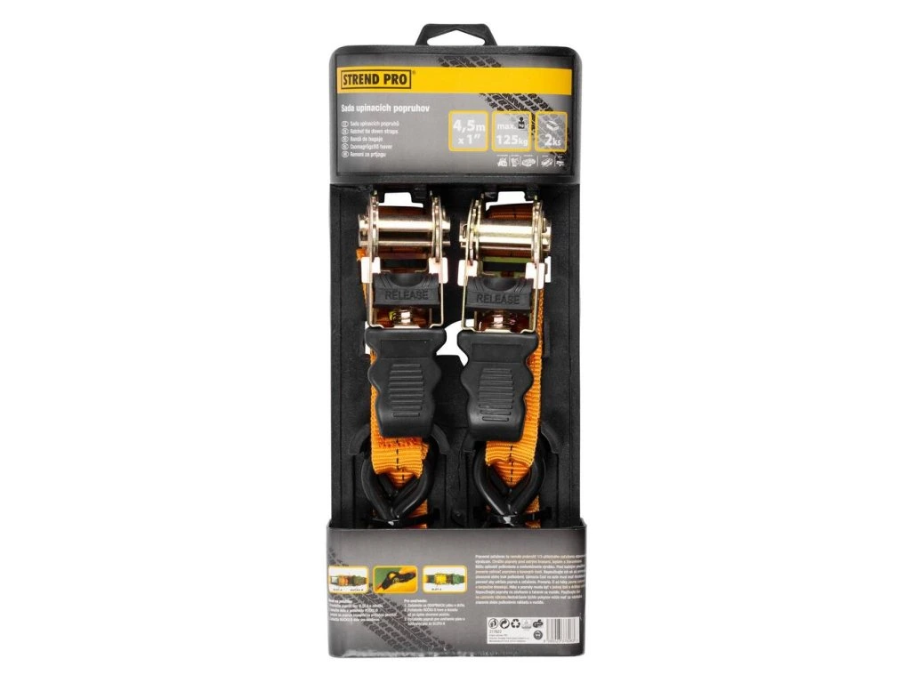 Upínací popruh Strend Pro má široké spektrum využitia. Slúži na zviazanie tovaru, zavetrovanie konštrukcií, na kotvenie stanov, koncertných stage-ov a podobne. Jeho dĺžka je 4,5 m a maximálna nosnosť je 125 kg. Balenie obsahuje 2 ks.Technické parametre: