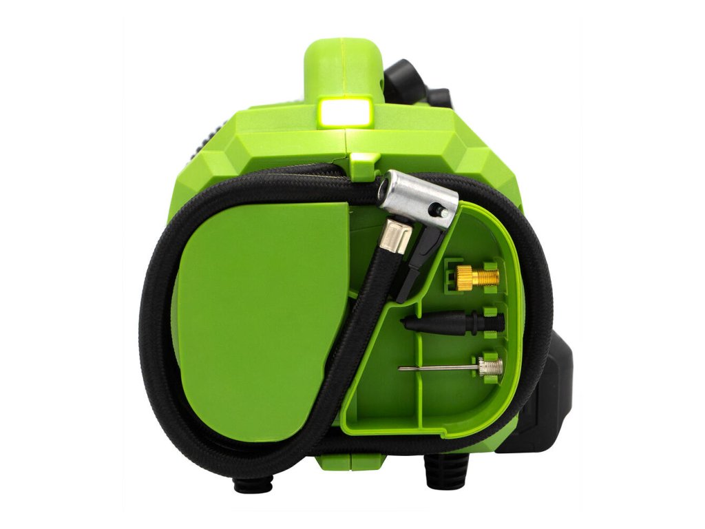 Akumulátorový kompresor a pumpa s príslušenstvom zo série akumulátorového náradia 18V E3. Kompresor na fúkanie vysokým tlakom, napríklad...
