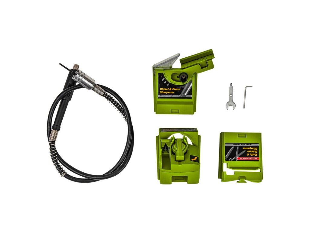 Súčasťou balenia je blok na ostrenie dlát, sekáčov a čepelí, blok na ostrenie vrtákov, blok na ostrenie nožov a nožníc, matica a šesťhranný kľúč. Kartónové balenie.
