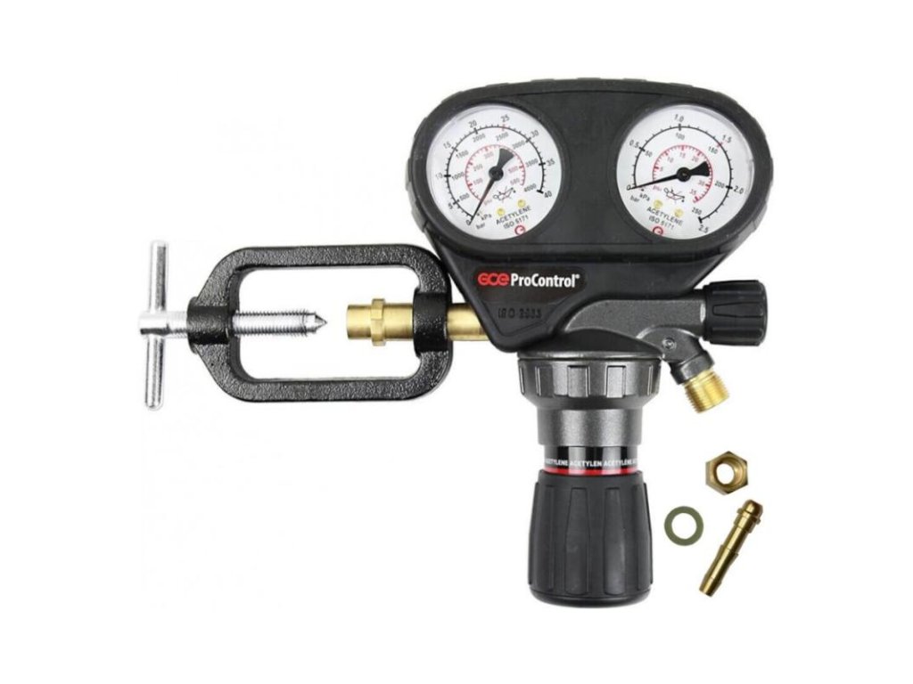 Redukčný Ventil GCE ProControl na Acetylén: navrhnutý pre presnú kontrolu acetylénového plynu, robustná konštrukcia, vstupný tlak do 25 bar, výstupný tlak 0-1,5 baru.
