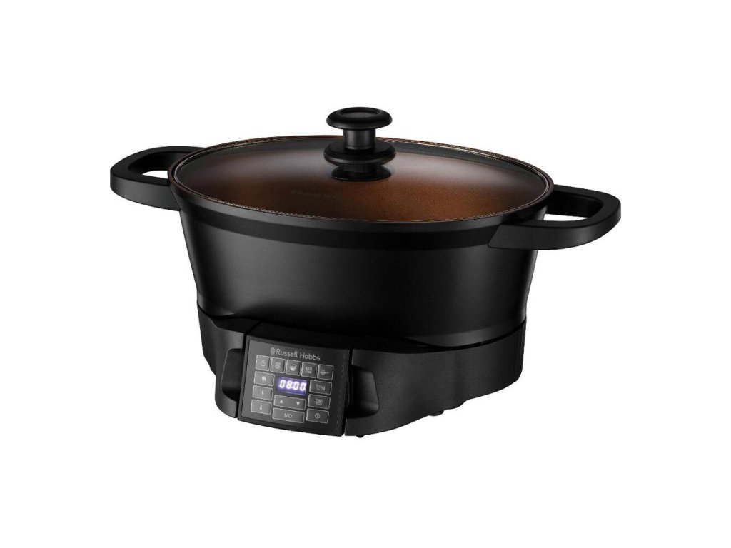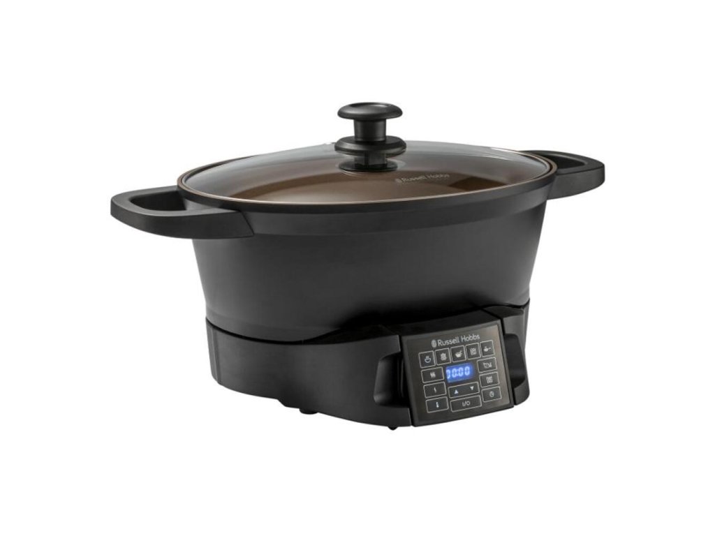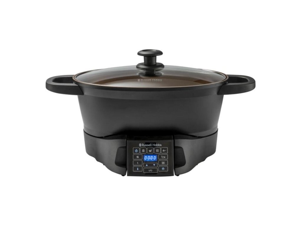 - Russell-Hobbs 28270–56 Good To Go Multi Cooker ponúka 8 funkcií, digitálne nastavenie a časovač, robustnú hliníkovú základňu a veko z tvrdeného skla s možnosťou zavesenia.