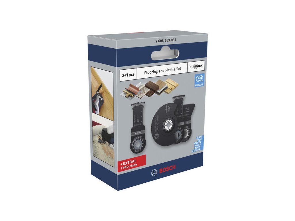 Sada na podlahové krytiny a kladenie podláh poskytuje podlahárom všetky typy čepelí do oscilačného viacúčelového náradia potrebných na rezanie všetkých štandardných podlahových materiálov a prípravu povrchov na novú podlahu. Sada na podlahové krytiny a kladenie podláh obsahuje odolné čepele do oscilačného viacúčelového náradia na rezanie dreva, laminátov a mäkkých kovov, ako aj odstraňovanie malty a lepidla na koberce z podlahových povrchov.