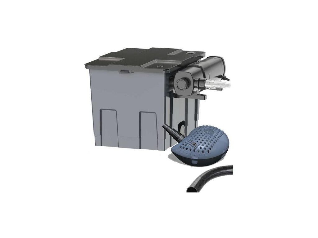Súprava obsahuje: Výkonné nastaviteľné filtračné čerpadlo (prepravuje nečistoty do priemeru 4 mm), UV lampu proti riasam (18 W), 5 m spojovaciu hadicu (25 mm) a filtračné médiá (filtračné huby rôznej hrubosti, japonskú rohož, domčeky na osídlenie baktériami).