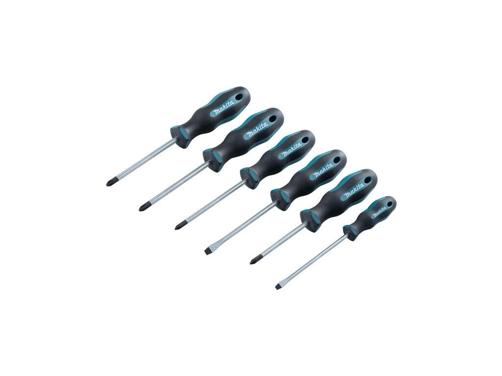 Sada skrutkovačov Makita E-10528 je kompletná 6-dielna súprava, ktorá pokrýva najpoužívanejšie profily (Ploché, Phillips a Pozidriv) pre široké spektrum montážnych a servisných prác. Každý skrutkovač je vyrobený z kvalitnej chróm-vanádiovej (Cr-V) ocele, ktorá zaručuje dlhú životnosť a vysokú odolnosť proti opotrebeniu.
