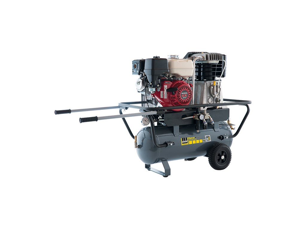Priamo pripojený jednovalcový piestový kompresor s benzínovým motorom. Dva manometre na tlak vo vzdušníku a pracovný tlak. Veľké kolesá...